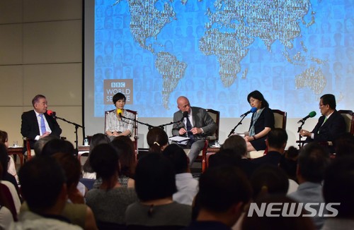 【서울=뉴시스】최동준 기자 = 14일 오후 서울 서대문구 이화여대 LG컨벤션홀에서 주한영국문화원과 BBC 월드서비스 공동주최로 열린 BBC 국제시사토론회에서 패널들이 북미정상회담과 한반도 평화 등 주요 현안에 대해 발언하고 있다.