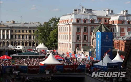 【상트페테르부르크(러시아)=뉴시스】고범준 기자 = 2018 러시아월드컵이 개막한 14일(현지시간) 러시아 상트페테르부르크 네프스키대로 인근에서 열린 피파 팬 페스트에서 축구팬들이 응원을 하고 있다. 2018.06.15.