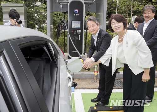 【서울=뉴시스】 안병옥 환경부 차관이 15일 서울 여의도 국회 전기자동차 급속충전소 준공식에 참석해 전기차 충전 시연을 하고 있다. 2018.06.15. (사진=환경부 제공)