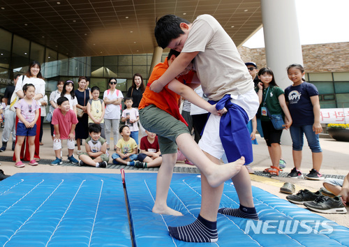 【서울=뉴시스】김진아 기자 = 단오(음력 5월5일)를 하루 앞둔 17일 서울 송파구 한성백제박물관에서 열린 단오 박물관 나들이 행사에서 어린들이 단오를 대표하는 민속놀이인 ‘씨름’을 하고 있다. 2018.06.17.