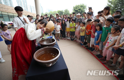 【서울=뉴시스】김진아 기자 = 단오(음력 5월5일)를 하루 앞둔 17일 서울 송파구 한성백제박물관에서 열린 단오 박물관 나들이 행사에서 선생님이 청포물에 머리감기 체험을 하고 있다. 2018.06.17.
