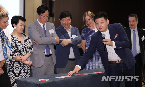 【서울=뉴시스】조수정 기자 = 19일 오후 서울 한남동 그랜드하얏트서울호텔에서 열린 한국이미지커뮤니케이션연구원(CICI) 코리아 씨큐(Korea CQ) 한국 통(通) 포럼 여름맞이 총 동문 모임에서 데이비드 카퍼필드가 극찬한 마술영재 권준혁 씨가 마술 시연을 하고 있다. 2018.06.19. [email protected]
