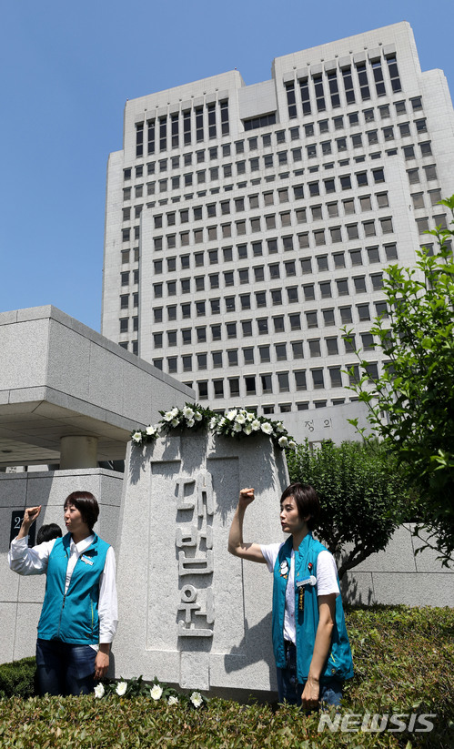 【서울=뉴시스】박주성 기자 = KTX열차승무지부와 KTX 해고승무원 문제해결을 위한 대책위가 21일 오전 서울 서초구 대법원 앞에서 사법농단 수사의 변호사를 자처하고 나선 대법원을 규탄하며 대법원 표지석에 국화꽃을 올려 놓고 있다.