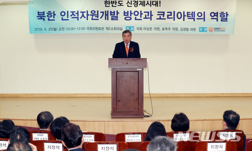 【서울=뉴시스】이종철 기자 = 25일 오전 서울 여의도 국회 의원회관에서 열린 한반도 신경제시대 '북한 인적자원개발 방안과 코리아텍의 역할' 세미나에 참석한 바른미래당 이상돈 의원이 축사를 하고 있다. 2018.06.25.