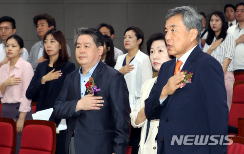 【서울=뉴시스】이종철 기자 = 25일 오전 서울 여의도 국회 의원회관에서 열린 한반도 신경제시대 '북한 인적자원개발 방안과 코리아텍의 역할' 세미나에 참석한 오른쪽 부터 바른미래당 이상돈 의원, 더불어민주당 송옥주 의원, 김경협 의원이 국기에 대한 경례를 하고 있다. 2018.06.25.
