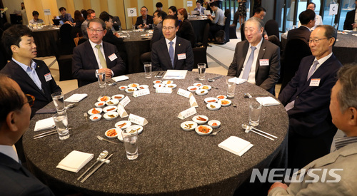 【서울=뉴시스】박영태 기자 = 27일 오전 서울 영등포구 여의도 63컨벤션에서 진행된 홍영표 더불어민주당 원내대표의 중견기업연합회 CEO 정기조찬회에서 홍 원내대표가 참석자들과 이야기를 나누고 있다. 2018.06.27.