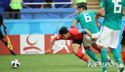 【카잔(러시아)=뉴시스】고범준 기자 = 27일(현지시간) 오후 러시아 카잔 아레나에서 열린 2018 러시아월드컵 조별리그 F조 3차전 대한민국-독일의 경기, 한국 손흥민이 독일 사미 케디라의 수비에 걸려 넘어지고 있다. 2018.06.27.
