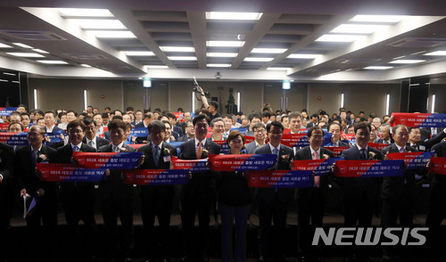 【서울=뉴시스】추상철 기자 = 2018 철도의 날 기념식이 열린 28일 오전 서울 종로구 세종문화회관에서 김현미 국토교통부장관을 비롯한 내빈이 '0628 새로운 출발 새로운 역사 한반도를 넘어 대륙으로' 슬로건 퍼포먼스를 하고 있다.