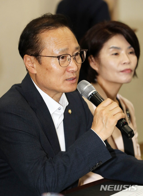 【성남=뉴시스】홍효식 기자 = 더불어민주당 홍영표 원내대표가 6일 오후 경기 성남시 중원구 아이에스시(반도체 테스트 소켓생산기업) 회의실에서 열린 일자리 현장 정책 간담회에 참석해 모두발언을 하고 있다. 오른쪽은 한정애 소득주도성장팀장. 2018.07.06.