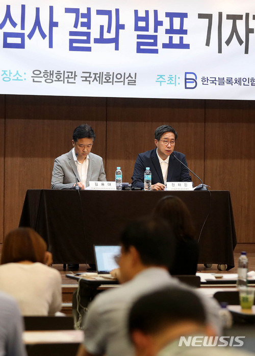 【서울=뉴시스】추상철 기자 = 한국블록체인협회의 '제1차 자율규제심사 결과 발표 기자간담회'가 열린 11일 오전 서울 중구 은행회관에서 자율규제위원회 전하진(오른쪽) 위원장과 김용대 정보보호위원장이 심사 결과를 발표하고 있다. 2018.07.11.