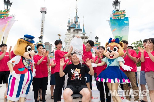 【서울=뉴시스】 13일 서울 송파구 롯데월드 매직캐슬 앞에서 박동기 롯데월드 대표이사가 아이스버킷 챌린지에 동참하고 있다.