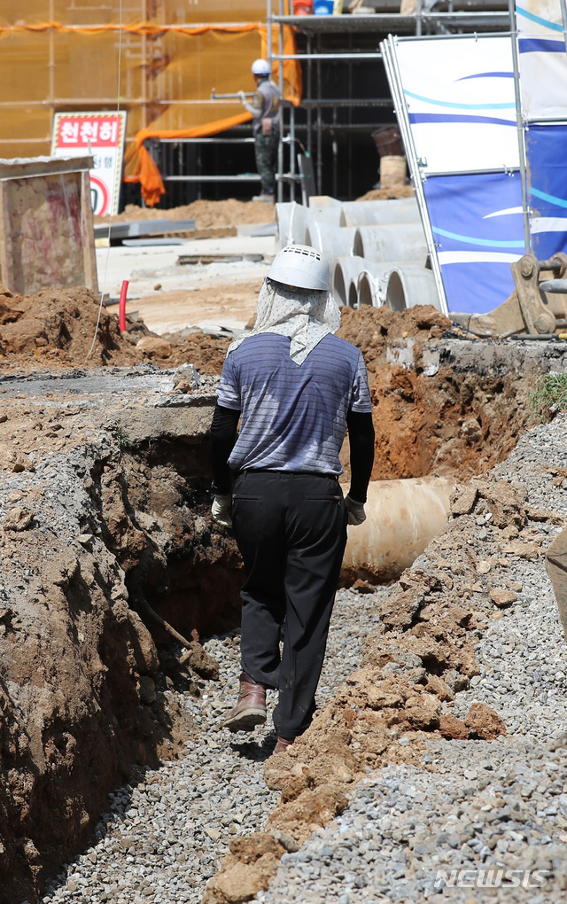 【서울=뉴시스】이영환 기자 = 연일 불볕더위가 이어지며 서울과 전국 대부분의 지역에 폭염 경보가 내린 19일 오후 서울 동작구의 한 공사현장에서 관계자들이 작업을 하고 있다. 2018.07.19.