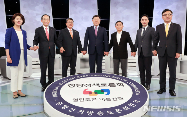 【서울=뉴시스】고승민 기자 = 20일 오전 서울 여의도 KBS 본관 스튜디오에서 중앙선거방송토론위원회 주최로 열린 2018년 제1차 정당정책토론회에서 각 당 정책담당 대표자들이 토론회 전 기념촬영을 하고 있다.