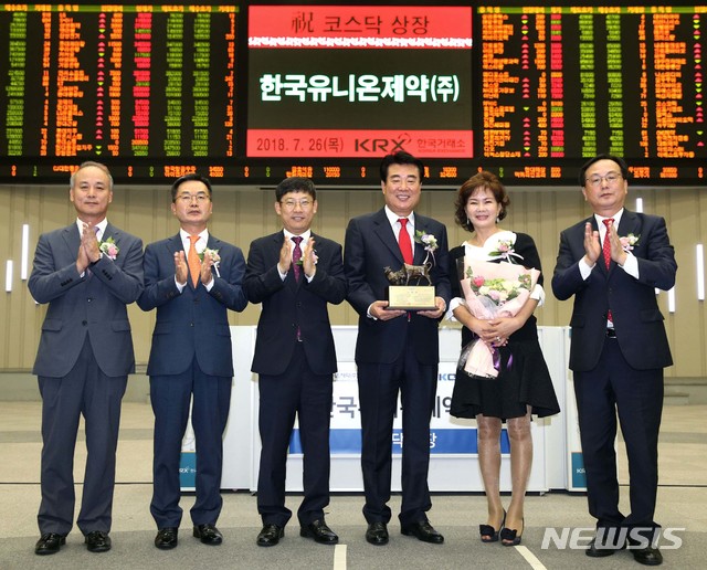 【서울=뉴시스】 한국거래소 코스닥시장본부는 26일 오전 서울 여의도 서울사옥 홍보관에서 항생제류 등 의약품 제조업체인 한국유니온제약의 코스닥시장 신규상장기념식을 개최했다.