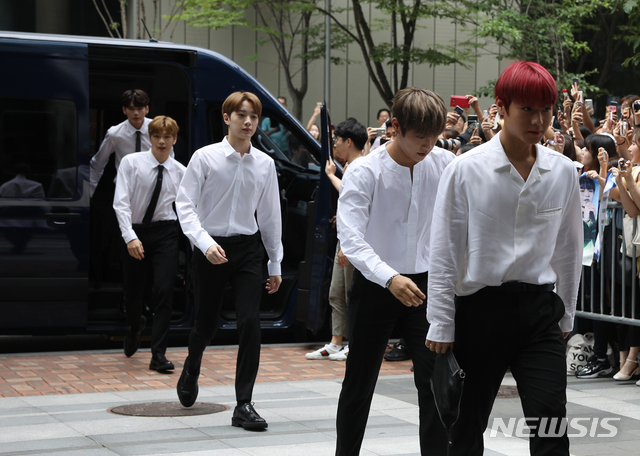 【서울=뉴시스】조수정 기자 = 그룹 워너원 1주년 기념 역조공 이벤트 땡스카페 팬미팅이 열린 7일 상암동에서 강다니엘 등 멤버들이 입장하고 있다. 오른쪽부터 박지훈, 박우진, 라이관린, 강다니엘, 옹성우. 2018.08.07. [email protected]