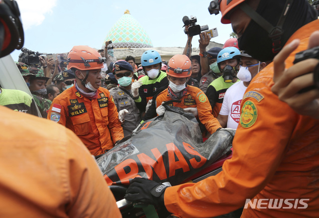 【방살=AP/뉴시스】인도네시아 롬복 섬 북쪽 방살에서 8일 구조대원들이 강진으로 무너진 이슬람 사원에서 수습한 시신을 옮기고 있다. 인도네시아 재난구호기구는 지난 5일 인도네시아 롬복섬을 강타한 강진으로 인한 사망자 수가 131명으로 늘어났다고 8일 밝혔다. 2018.08.08
