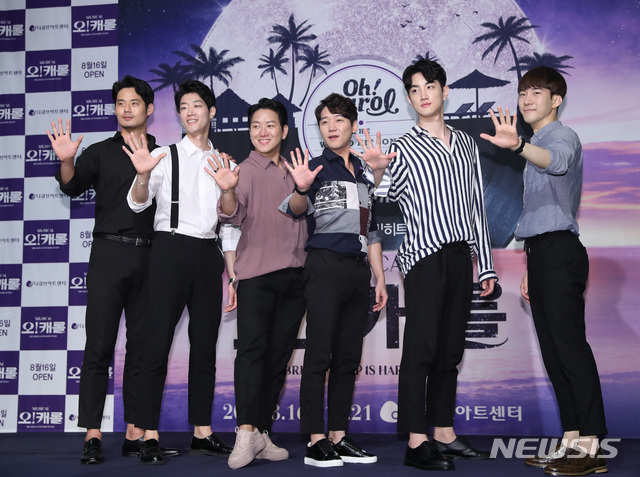 【서울=뉴시스】조수정 기자 = 뮤지컬 '오!캐롤' 제작발표회가 열린 9일 오후 서울 역삼동 노보텔앰배서더강남에서 배우들이 포즈를 취하고 있다. 왼쪽부터 서경수, 박영수, 정원영, 박한근, 김태오, 조환지.  뮤지컬 '오!캐롤'은 8월 16일부터 10월 21일까지 디큐브아트센터에서 공연한다. 2018.08.09. [email protected]