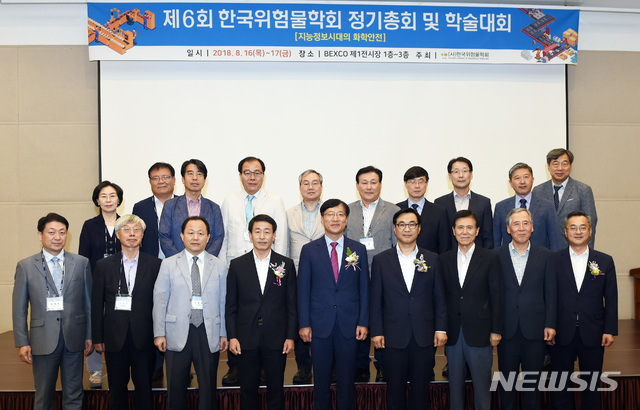 【서울=뉴시스】김진아 기자 = 류희인 행정안전부 재난안전관리본부장이 16일 오후 부산 벡스코(BEXCO) 제1전시장에서 열린 ‘한국위험물학회 정기총회 및 학술대회’에 참석해 관계자들과 기념촬영을 하고 있다. 2018.08.16. (사진=행정안전부 제공)