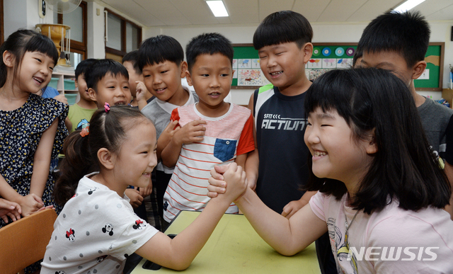 【전주=뉴시스】 김얼 기자 = 전국적으로 초등학교 개학이 실시된 20일 전북 전주시 완산구 전주완산서초등학교에서 1학년 학생들이 팔씨름을 하며 방학 동안 기른 힘을 겨루고 있다. 2018.08.20