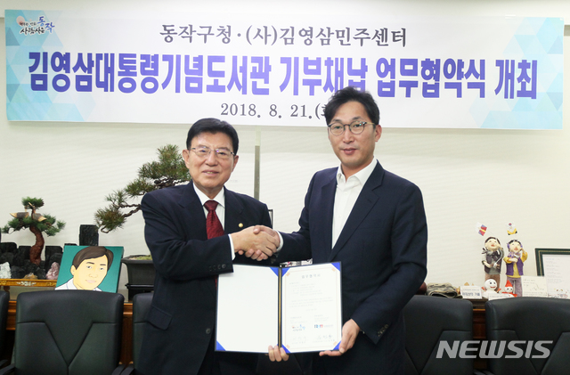 【서울=뉴시스】이창우(오른쪽) 동작구청장이 21일 오전 서울 동작구청사에서 김덕룡(사) 김영삼민주센터 이사장과 故김영삼  전 대통령 기념도서관 기부채납 업무 협약식을 마친 뒤 기념 촬영을 하고 있다. 2018.08.21.(사진=동작구청 제공)