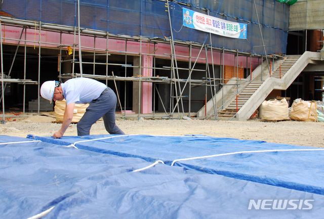 【충주=뉴시스】이병찬 기자 = 23일 충북 서충주신도시의 신설 중학교 건설공사 현장 관계자가 북상 중인 태풍 '솔릭'에 대비해 건설자재를 단단히 묶고 있다.2018.08.23.