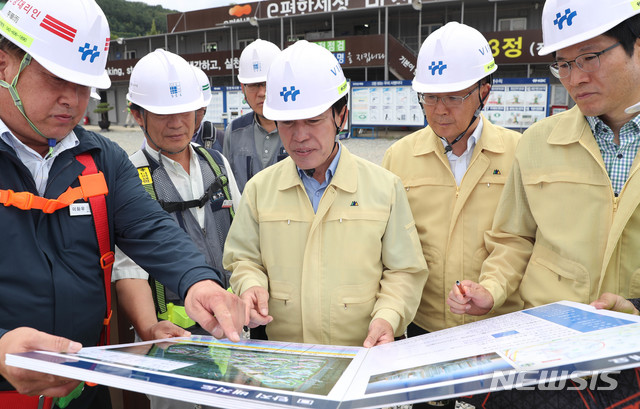 【대전=뉴시스】조명휘 기자 = 황인호 대전 동구청장이 23일 제19호 태풍 '솔릭'의 접근과 관련해 용운동의 한 아파트 건설현장을 찾아 안전관리실태를 점검하고 있다. 2018.08.23. (사진= 동구청 제공)