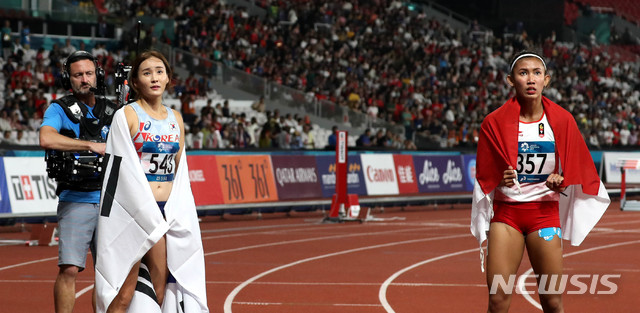【자카르타(인도네시아)=뉴시스】추상철 기자 = 2018 자카르타-팔렘방 아시안게임 육상 여자 100m 허들 결선 경기가 열린 26일(현지시각) 오후 인도네시아 자카르타 겔로라 붕 카르노(GBK) 메인 스타디움에서 금메달을 딴 대한민국 정혜림이 기록을 확인하고 있다. 2018.08.26.