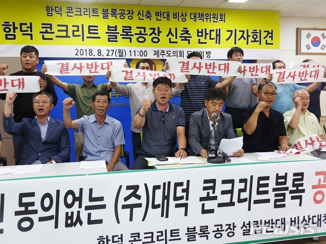 【제주=뉴시스】조수진 기자 = 27일 오전 제주 함덕 콘크리트 블록공장 신축반대 비상대책위원회가 제주도의회 도민의 방에서 공사 백지화를 촉구하는 기자회견을 열고 있다. 2018.08.27.