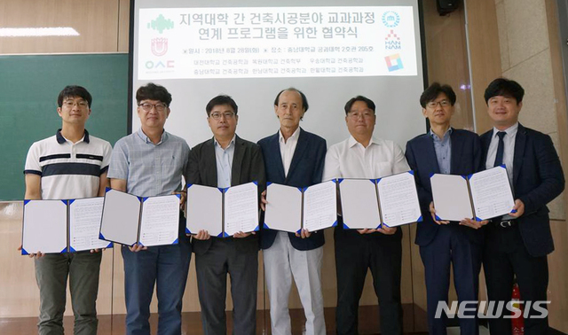 【대전=뉴시스】유순상 기자 = 충남대와 한밭대, 대전대, 목원대, 우송대, 한남대 건축공학계열 교수들이 28일 충남대 건축공학과에서 '지역대학 간 건축시공분야 교과과정 연계 프로그램 구축' 협약을 체결하고 기념촬영을 하고 있다. 대전 6개대 건축공학계열 학과들은 10개 교과목에 대한 연계 프로그램을 마련한다. 2018.08.28.(사진=충남대 제공)