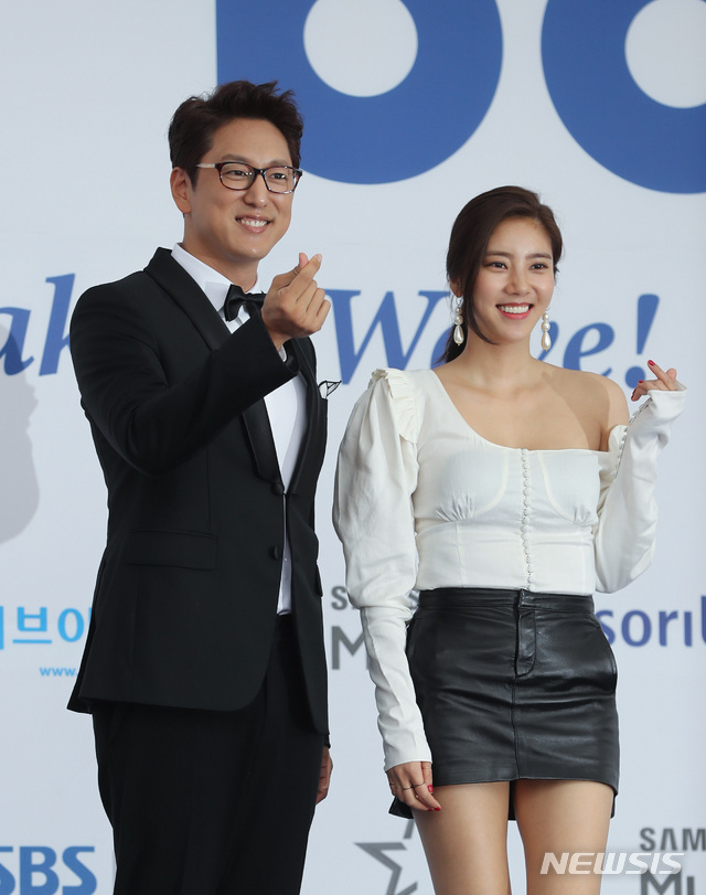 【서울=뉴시스】조수정 기자 = '2018 소리바다 베스트 케이(K)-뮤직 어워즈' 블루카펫 행사가 열린 30일 저녁 서울 송파구 방이동 올림픽공원 체조경기장에서 사회자인 한석준 아나운서와 가수 손담비(오른쪽)가 포즈를 취하고 있다.  2018.08.30.