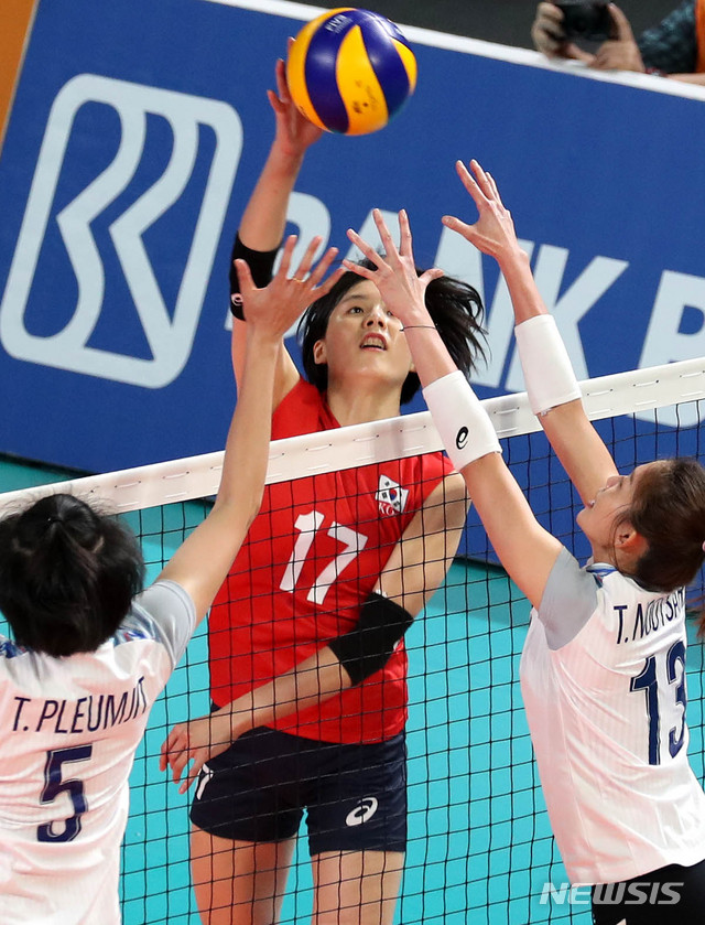 【자카르타(인도네시아)=뉴시스】추상철 기자 = 2018 자카르타-팔렘방 아시안게임 트랙 사이클 여자 메디슨 결승 경기가 열린 31일(현지시각) 오후 인도네시아 자카르타 겔로라 붕 카르노(GBK) 배구경기장에서 대한민국 이재영이 강스파이크를 때리고 있다. 2018.08.31.
