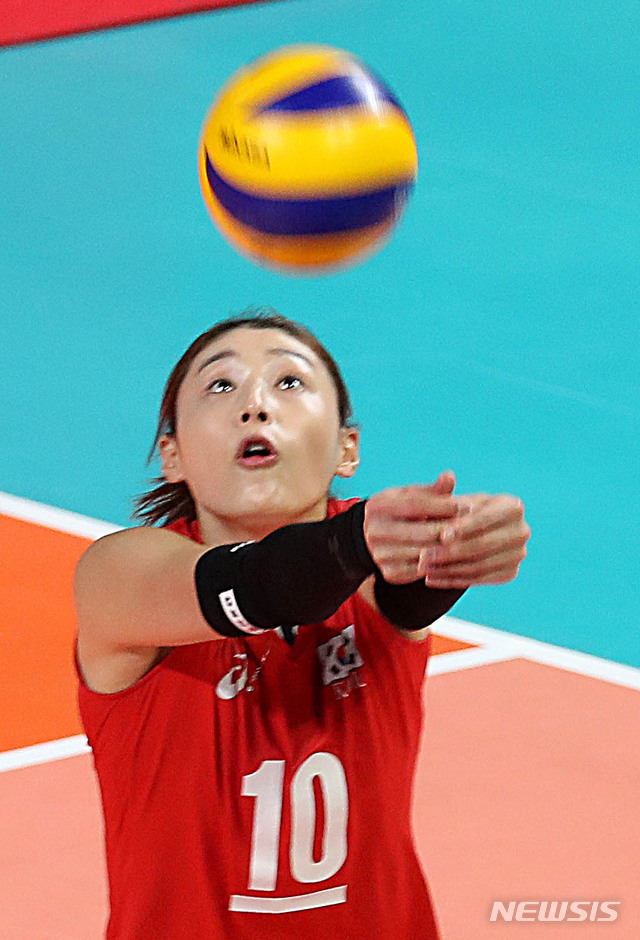 【자카르타(인도네시아)=뉴시스】추상철 기자 = 2018 자카르타-팔렘방 아시안게임 트랙 사이클 여자 메디슨 결승 경기가 열린 31일(현지시각) 오후 인도네시아 자카르타 겔로라 붕 카르노(GBK) 배구경기장에서 대한민국 김연경이 리시브를 하고 있다. 2018.08.31.