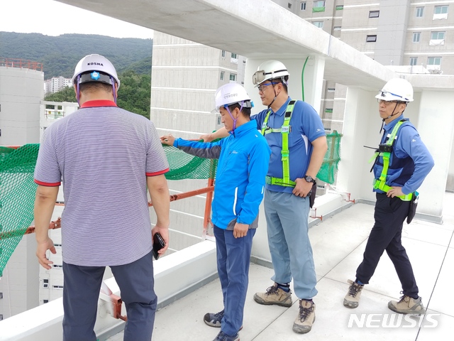 【부산=뉴시스】 제갈수만 기자 = 안전보건공단 부산지역본부는 4일 포스코건설 부산 연산 더샵 신축공사현장에서 제270차 안전점검의 날 행사를 가졌다.2018.09.04. (사진= 안전보건공단 부산본부 제공)