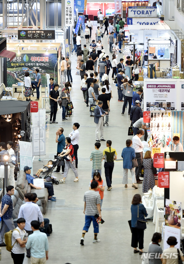 【대구=뉴시스】우종록 기자 = 6일 오후 대구 북구 산격동 엑스코에서 열린 대구·경북 대표 건축박람회인 '2018 대구경향하우징페어'에서 관람객들이 건축자재, 홈인테리어 등 관련 전시 부스를 둘러보고 있다. 2018.09.06.