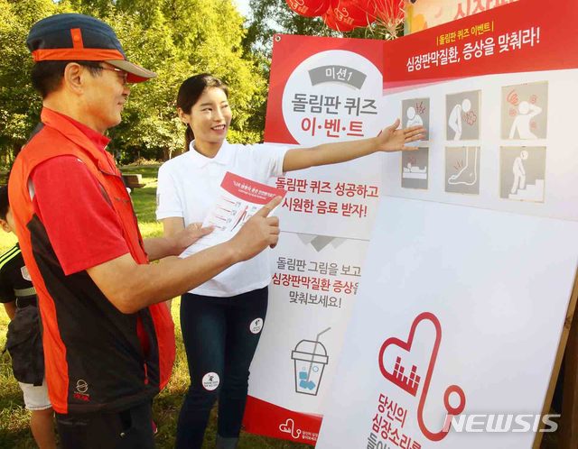 【서울=뉴시스】8일 서울 송파구 올림픽공원에서 한국심장재단이 주최한 '2018 심장병 예방을 위한 한걸음 더 걷기대회'에서 에드워즈라이프사이언시스코리아 임직원들이 심장판막질환 인식 향상을 위한 캠페인을 펼치고 있다. 2018.09.08. (사진=에드워즈라이프사이언시스코리아 제공)