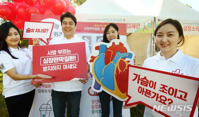 【서울=뉴시스】8일 서울 송파구 올림픽공원에서 한국심장재단이 주최한 '2018 심장병 예방을 위한 한걸음 더 걷기대회'에서 에드워즈라이프사이언시스코리아 임직원들이 심장판막질환 인식 향상을 위한 캠페인을 펼치고 있다. 2018.09.08. (사진=에드워즈라이프사이언시스코리아 제공)