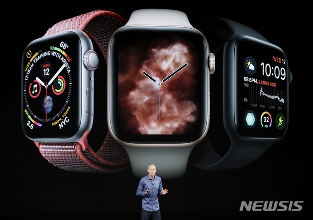 【쿠퍼티노(캘리포니아)=AP/뉴시스】제프 윌리엄스 최고운영책임자(COO)가 12일(현지시간) 미국 캘리포니아 주 쿠퍼티노 스티브 잡스 극장에서 열리고 있는 신형 아이폰 공개 행사에서 애플워치 시리즈4를 소개하고 있다. 2018.09.13.