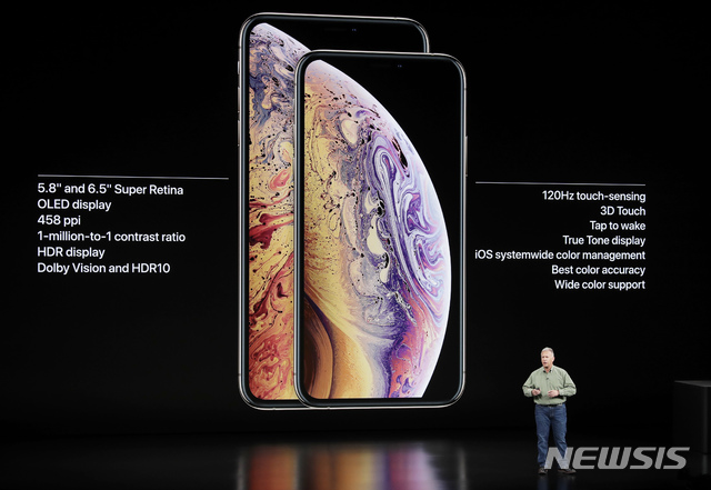 【쿠퍼티노(캘리포니아)=AP/뉴시스】애플 수석 부사장 필 쉴러가 12일(현지시간) 미국 캘리포니아 주 쿠퍼티노 스티브 잡스 극장에서 열리고 있는 신형 아이폰 공개 행사에서 아이폰 XS와 XS맥스에 대해 소개하고 있다. 2018.09.13.