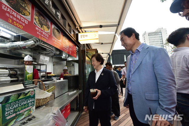 【서울=뉴시스】 신촌기차역 앞 ‘신촌 박스퀘어’ 오픈식이 열린 15일 오후 문석진 서대문구청장(오른쪽)과 김혜숙 이화여대 총장이 입점 점포를 둘러보고 있다.