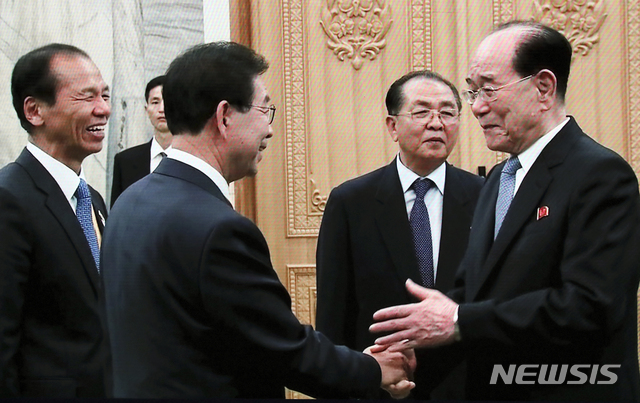 【남북정상회담 프레스센터(서울)=뉴시스】최진석 기자 = 18일 만수대의사당 대회의장에서 남북정상회담 특별수행단 박원순 서울시장과 최문순 강원도지사가 김영남 상임위원장과 인사를 나누는 모습이 서울 중구 동대문디자인플라자(DDP)에 차려진 남북정상회담 평양 서울 프레스센터 대형 화면에 중계되고 있다. 2018.09.18.