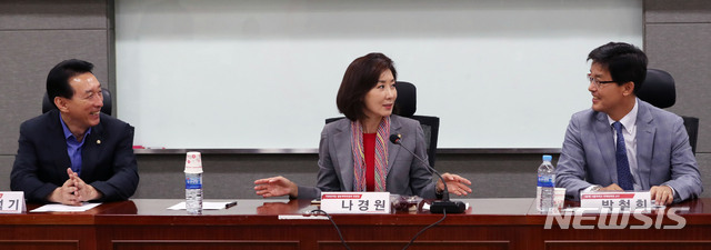 【서울=뉴시스】홍효식 기자 = 20일 오전 서울 여의도 국회 의원회관에서 열린 '일본 자민당의 정권복귀와 아베총리 중심의 자민당 우위체제 구축' 자유한국당 정당개혁위원회 공개 간담회에서 나경원, 김석기 의원과 박철희 서울대 국제대학원 교수가 대화를 나누고 있다. 2018.09.20.