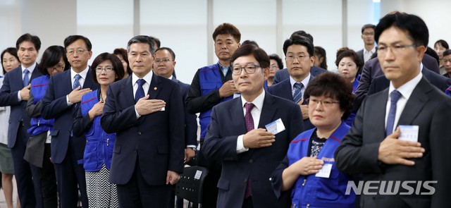 째【서울=뉴시스】고범준 기자 = 정경두 국방부 장관(왼쪽 다섯번째)과 이인람 군사망사고진상규명위원장(오른쪽 세번)등 참석자들이 28일 오후 서울 중구 포스트타워에서 열린 '군사망사고진상규명위원회 출범식'에서 국민의례를 하고 있다. 2018.09.28.