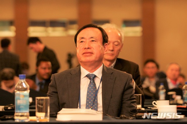 【평창=뉴시스】조명규 기자 = 11일 오후 강원 평창군 알펜시아 컨벤션센터에서 열린 '대한민국 탄소포럼 2018'에서 안병헌 한국기후변화연구원 원장이 로렌스 스미스 UCLA 교수의 초청강연을 경청하고 있다.