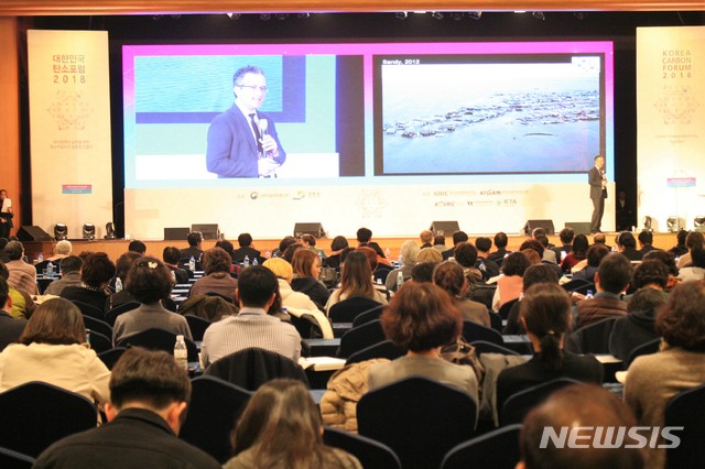 【평창=뉴시스】조명규 기자 = 11일 오후 강원 평창군 알펜시아 컨벤션센터에서 열린 '대한민국 탄소포럼 2018'에서 로렌스 스미스 UCLA 교수가 강연을 하고 있는 가운데 청중석이 가득 차 있다.