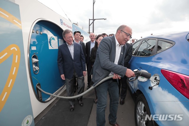 【파리(프랑스)=뉴시스】전신 기자 = 문재인 대통령이 14일(현지시간) 프랑스 파리 도심인 알마광장에서 가스 업체 에어 리퀴드가 운영 중인 수소 충전소를 방문해 현대자동차의 수소 전기차 '투싼'을 운전하고 있는 택시기사의 충전 시연을 바라보고 있다. 2018.10.15. (사진=청와대 제공)