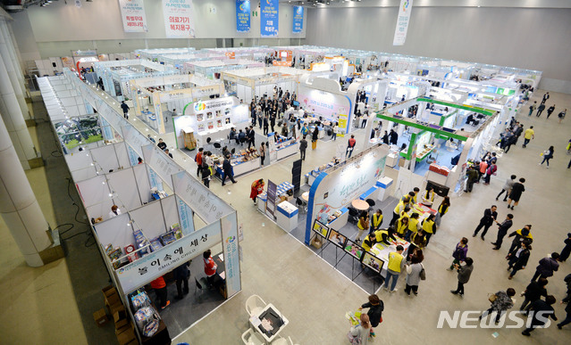 【대구=뉴시스】우종록 기자 = 2018 대구시니어 산업박람회가 열린 19일 오전 대구 북구 산격동 엑스코에서 어르신들이 시니어 제품 전시부스를 둘러보고 있다. 2018.10.19.