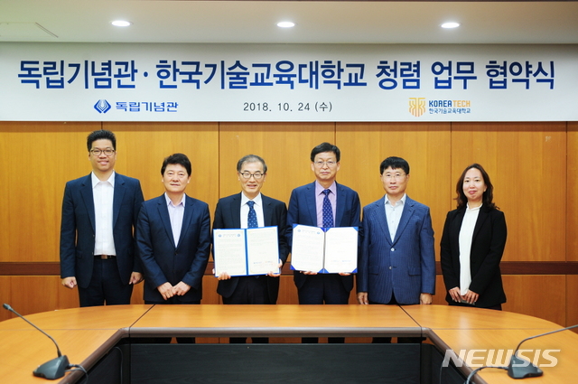 【천안=뉴시스】이종익 기자 =충남 천안의 코리아텍은 24일 오전 교내에서 독립기념관과 청렴업무 및 내부감사 역량 강화를 위해 감사인력 공동 활용 등을 추진하는 업무협약(MOU)를 체결했다. 2018.10.24. (사진=코리아텍 제공)