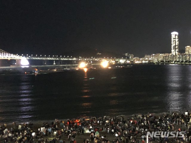【부산=뉴시스】 제갈수만 기자 =27일 오후 제14회 부산불꽃축제가 열린 부산 광안리대교 아래서 불꽃을 쏘아 올리던 바지선에서 오후 8시 57분께 불이 붙어 부산소방과 부산해경이 출동해 불을 끄고 있다.2018.10.27. (사진= 부산경찰청 제공)