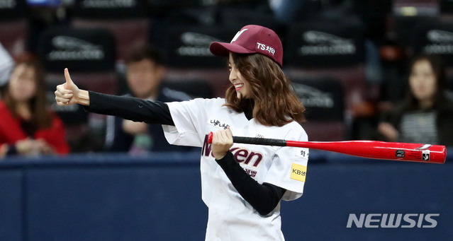 【서울=뉴시스】홍효식 기자 = 31일 오후 서울 구로구 고척스카이돔에서 열린 2018 KBO 포스트시즌 플레이오프 4차전 넥센 히어로즈와 SK 와이번스의 경기, '프로듀스 48' 출신 가수 허윤진이 시타한 뒤 포즈를 취하고 있다. 2018.10.31.