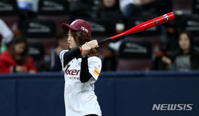 【서울=뉴시스】홍효식 기자 = 31일 오후 서울 구로구 고척스카이돔에서 열린 2018 KBO 포스트시즌 플레이오프 4차전 넥센 히어로즈와 SK 와이번스의 경기, '프로듀스 48' 출신 가수 허윤진이 시타를 하고 있다. 2018.10.31.